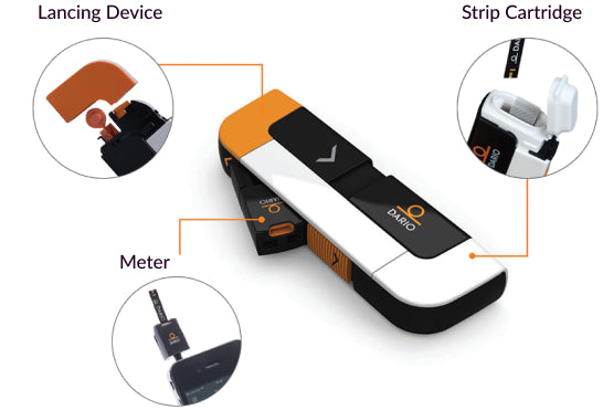 Dario combines the meter, lancing device, and strip cartridge into one compact device you can carry anywhere — discreet, simple, and always ready.